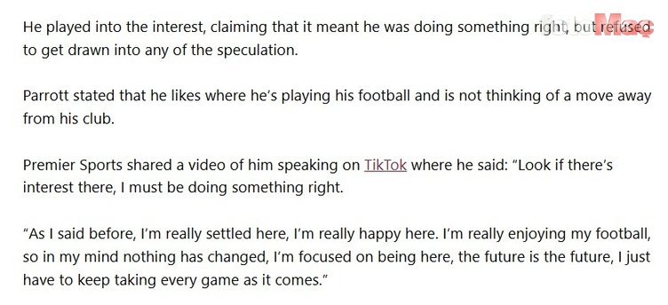 Premier Sports’a konuşan Parrott, “Eğer ilgi varsa bir şeyleri doğru yapıyorum demektir. Daha önce de söylediğim gibi AZ Alkmaar’da mutluyum. Futboldan gerçekten keyif alıyorum, bu yüzden aklımda hiçbir şey değişmedi. Burada olmaya odaklandım. Gelecek gelecektir, benim sadece maç maç devam etmem gerekiyor.” ifadelerini kullandı.