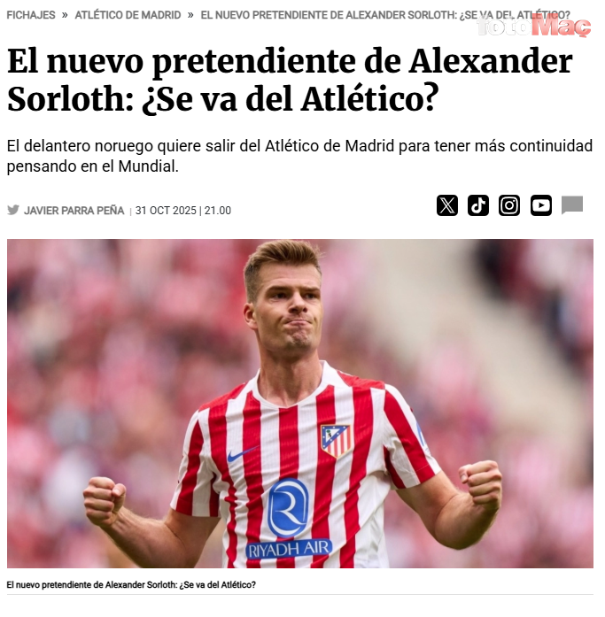 Haberin devamında kış transfer döneminin Sörloth için bir fırsat olabileceği yazılırken, Premier Lig’den Newcastle United’ın Norveçli futbolcuyu kadrosuna katmak için en büyük aday olarak gözüktüğü belirtildi. Atletico Madrid’in de en azından kendisinin yerine yeni bir transfer yapmak için 29 yaşındaki futbolcuyu tutmak istese de kış transferinde yaşanacak olası bir ayrılığa da kapılarını tamamen kapatmadığı yazıldı.