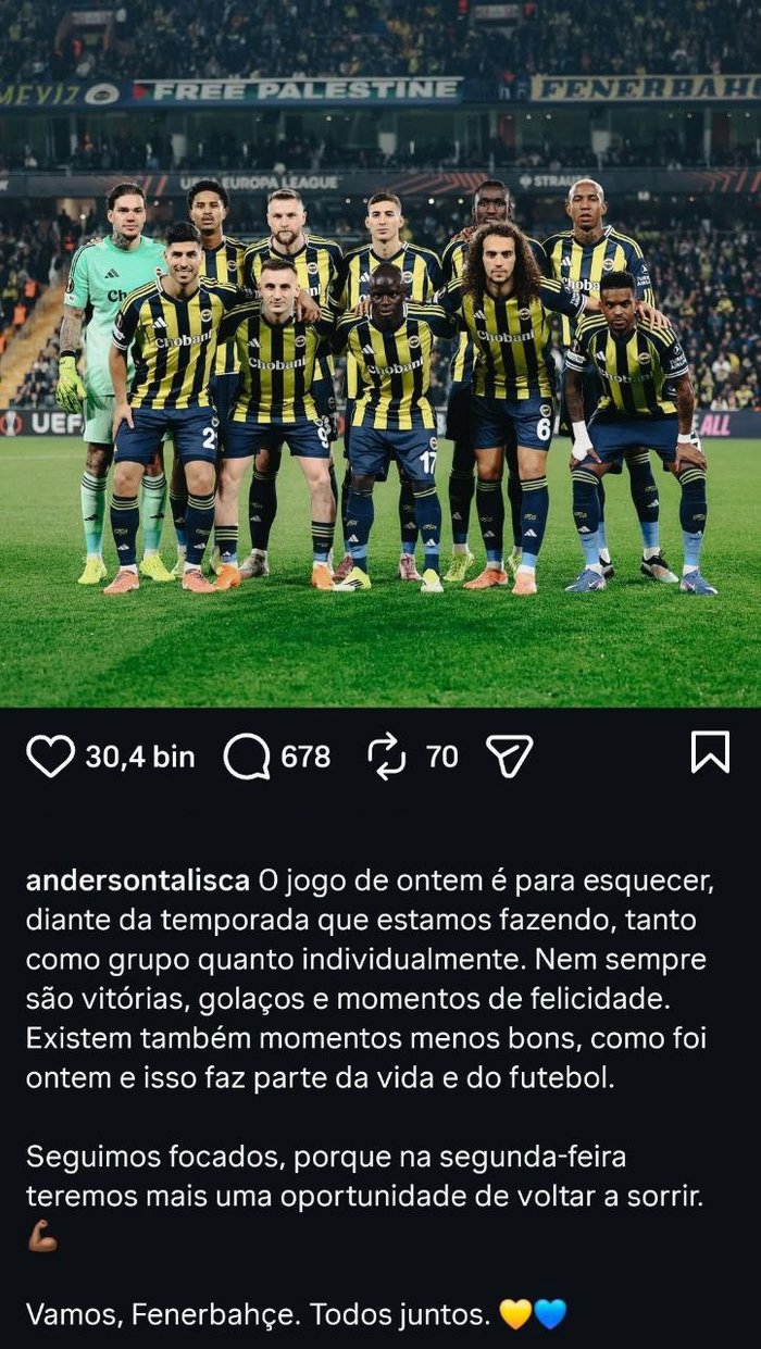 Fenerbahçe’nin yıldız ismi Anderson Talisca, sosyal medya hesabı üzerinden yaptığı paylaşım ile dikkat çekti. Nottingham Forest maçından sonraki gün paylaşımda bulunan Brezilyalı oyuncu, taraftarın yarasını sarmaya çalıştı. Talisca’nın paylaşımında, “Dünkü maç, hem takım hem de bireysel olarak geçirdiğimiz sezonu düşünürsek unutulması gereken bir maçtı. Hayatta her zaman zaferler ve mutluluk yoktur. Dün olanlar da hayatın ve futbolun bir parçası. Odaklanıyoruz çünkü Pazartesi günü tekrar gülümsemek için bir fırsatımız daha olacak. Haydi Fenerbahçe Hep birlikte.” ifadeleri yer aldı.