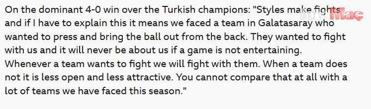 Açıklamalarına eklemeler yapan tecrübeli teknik adam, “Bunu bu sezon karşılaştığımız çoğu takımla kıyaslayamazsınız. Belki momentumu kırmaya çalışıyorlardı ama aynı zamanda pres yapmak ve topu oyuna sokmak isteyen bir Galatasaray takımıyla karşılaştık, bizimle mücadele etmek istediler.” ifadelerini kullandı.