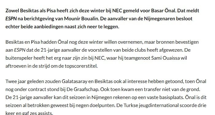 Voetbal Primeur’da yer alan habere göre Başar Önal, bu teklifleri reddetti. Kanat oyuncusunun NEC’de çok mutlu olduğu ve takım arkadaşı Sami Ouaissa ile girdiği gol krallığı yarışında onu geride bırakmaya odaklandığı belirtildi.