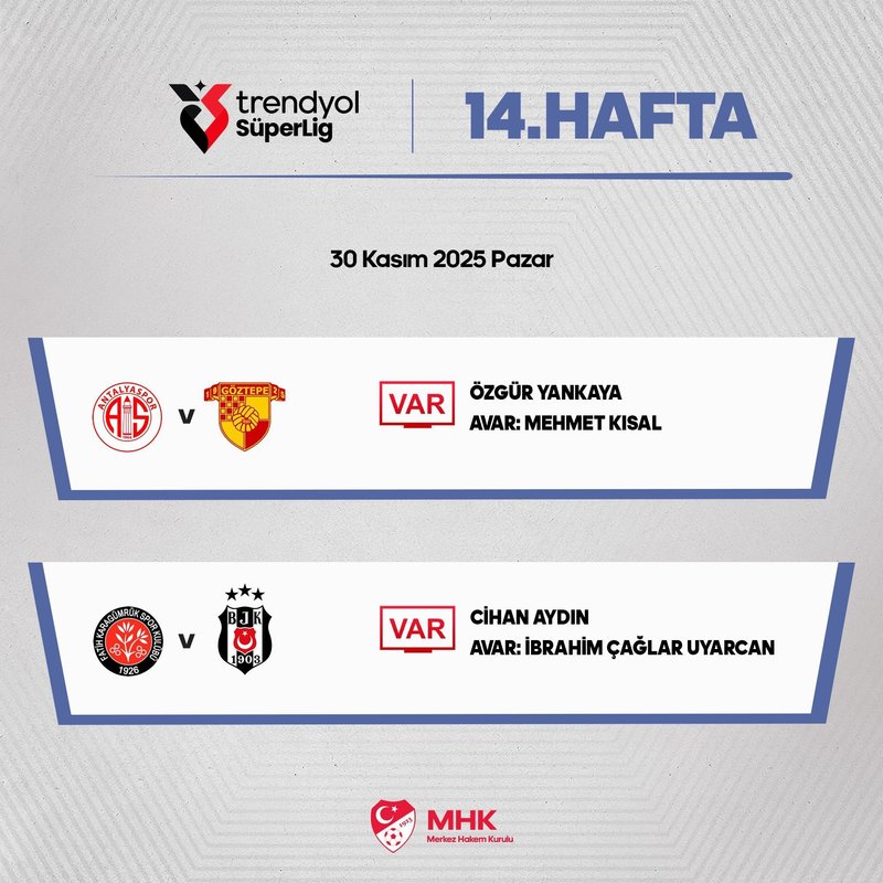 Merkez Hakem Kurulu (MHK), Trendyol Süper Lig’in 14. haftasında 30 Kasım 2025 Pazar günü oynanacak maçların VAR ve AVAR hakemlerini açıkladı.