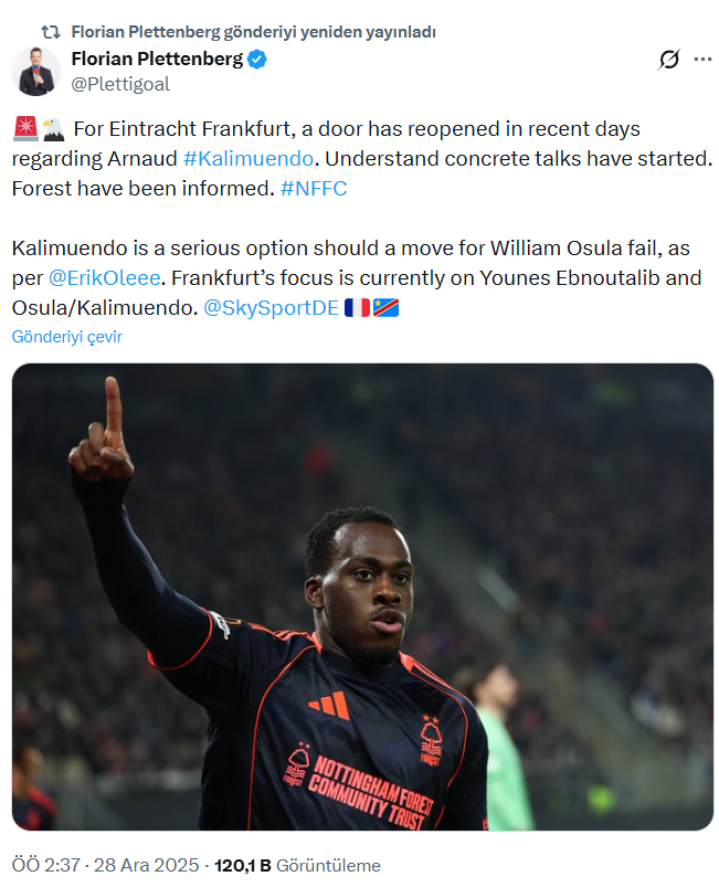 Bundesliga ekiplerinden Eintracht Frankfurt’un, Kalimuendo’nun transferi için Nottingham Forest ile görüşmelere başladığı öğrenildi. SKY Sport DE Muhabiri Florian Plettenberg’in haberine göre Frankfurt’un santrfor transferi için Newcastle United futbolcusu William Osula’ya öncelik verdiği, Osula’nın transferinin gerçekleşmediği takdirde ise Arnaud Kalimuendo’yu ciddi bir alternatif olarak değerlendirdiği öne sürüldü.