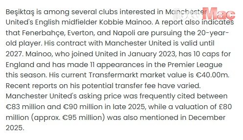 Manchester United ile mevcut sözleşmesi 2027 yılında sona erecek Kobbie Mainoo’nun, Transfermarkt verilerine göre 40 milyon Euro değeri bulunuyor.