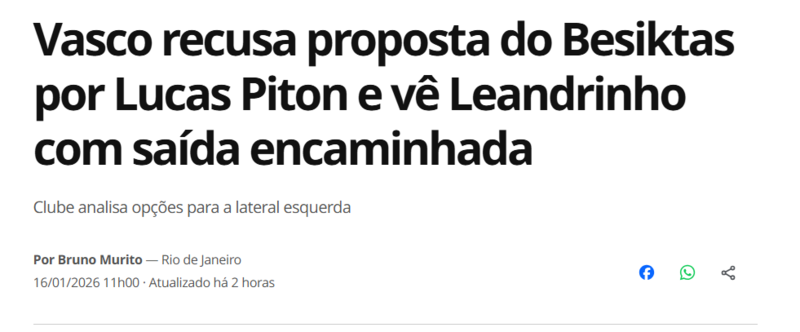 Brezilya basınından Globo’nun aktardığı habere göre Vasco, hiçbir oyuncusunu “satılmaz” olarak görmese de teknik direktör Fernando Diniz’in ilk 11’inin vazgeçilmezlerinden biri olan Piton’u ancak çok daha yüksek bir bonservis bedeli karşılığında elden çıkarmayı planlıyor. Yönetimin, oyuncunun yerini doldurabilecek aynı kalitede bir alternatif bulunmadan satışa onay vermeyeceği vurgulandı.