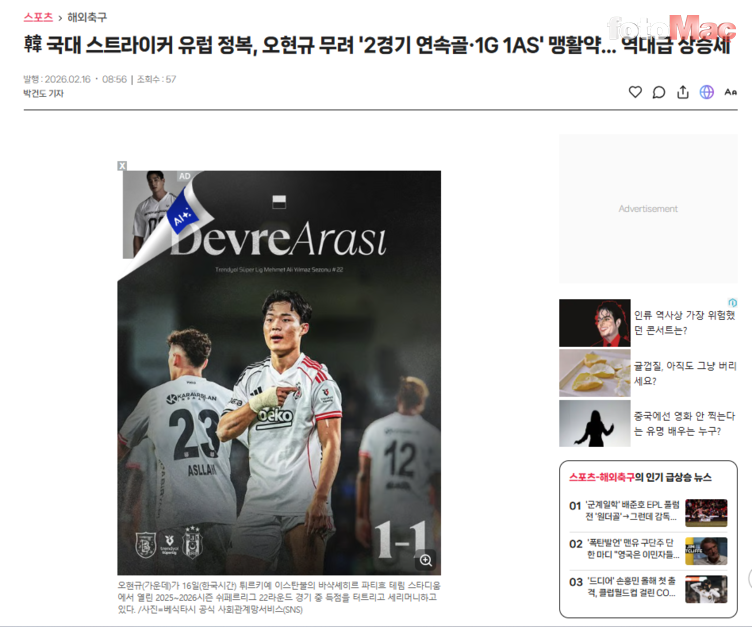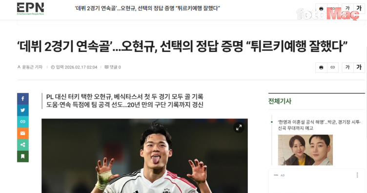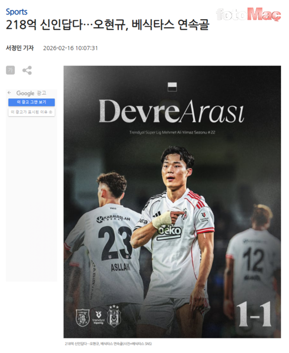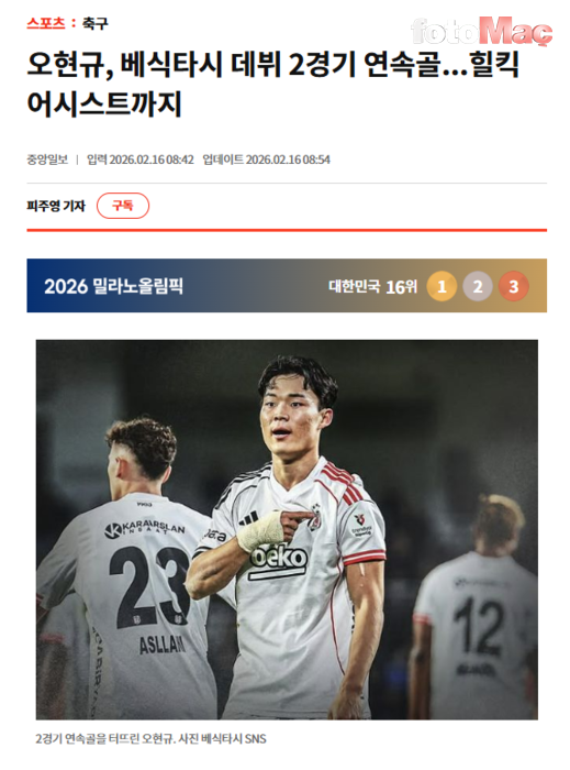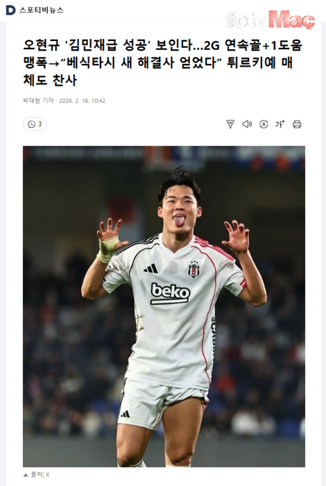 Hyeon-gyu Oh, Beşiktaş’taki performansıyla ülkesinde manşetleri süslerken haberlerde “Türkiye’ye mükemmel uyum sağladığı” vurgusu dikkat çekti. Gazeteler, Fenerbahçe formasıyla Türkiye’de başarılı olan ve çok sevilen Güney Koreli Kim Min Jae’ye de atıfta bulundu. İşte o haberler: