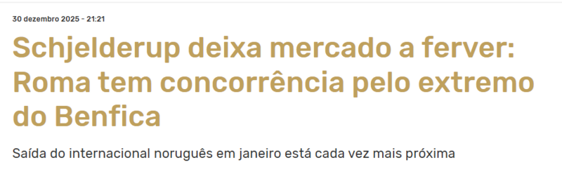 Transfermarkt verilerine göre güncel piyasa değeri 14 milyon euro olan Andreas Schjelderup’un Benfica ile 2028 yılına kadar sözleşmesi bulunuyor. Norveçli futbolcu yeni sezonda Benfica formasını 21 maçta giyerken takımına 2 gol 3 asistlik katkı sağladı.