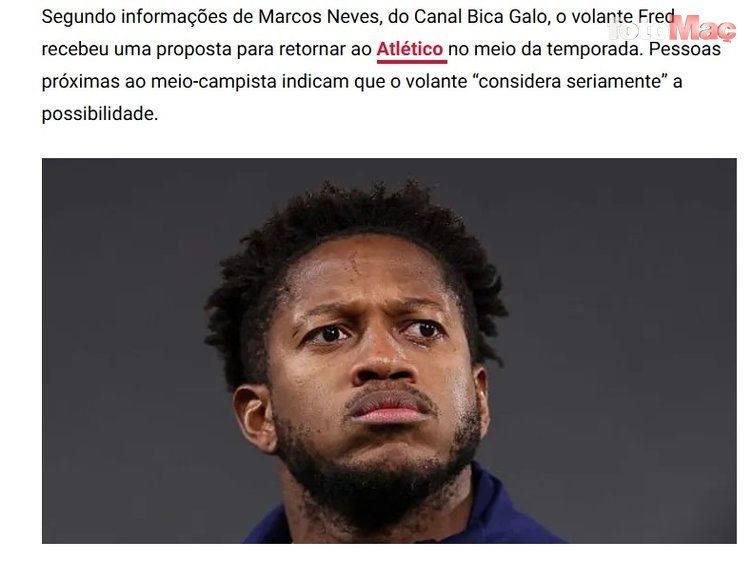 Fred’in de bu yaz Atletico Mineiro’ya imza atma olasılığını ciddi olarak değerlendirdiği kaydedildi. Bu haberin Fred’in yakın kaynakları tarafından da doğrulandığı aktarıldı.