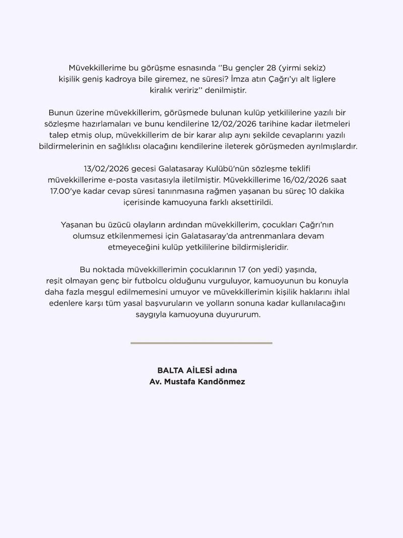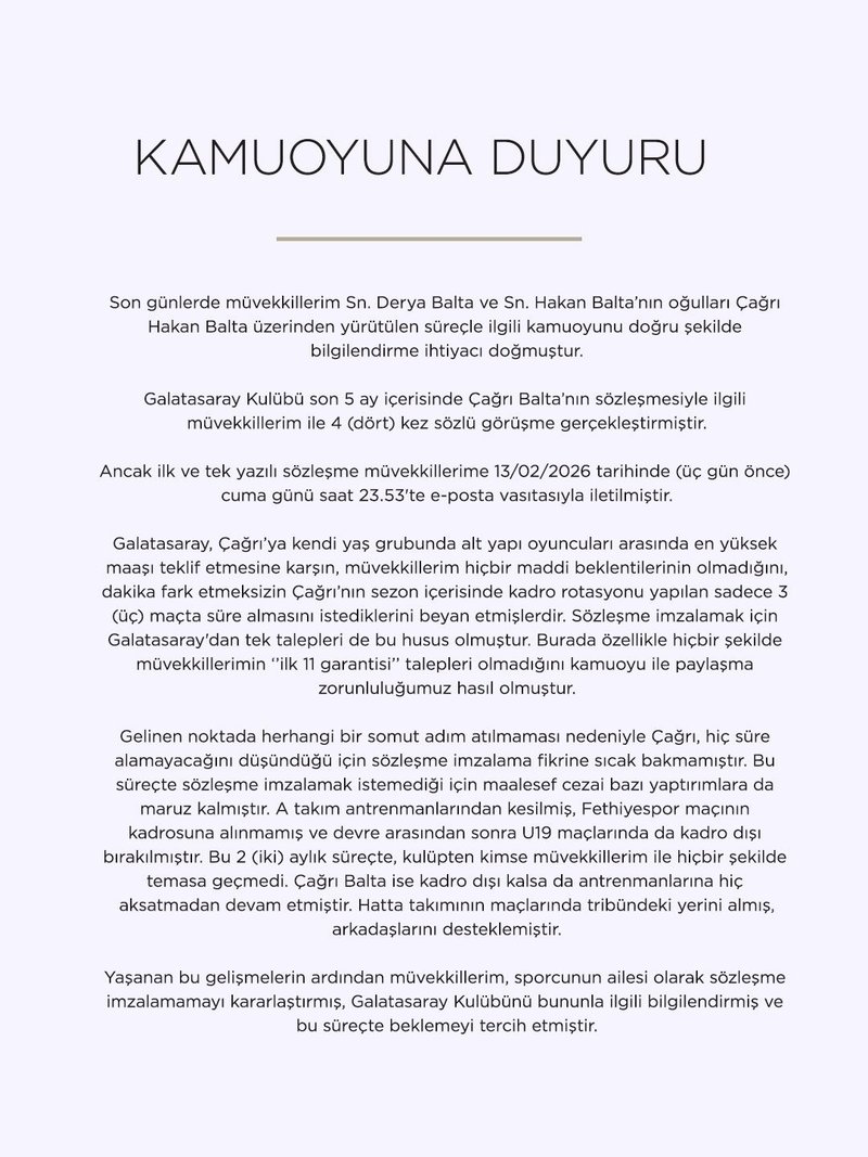 “Galatasaray, Çağrı’ya kendi yaş grubunda alt yapı oyuncuları arasında en yüksek maaşı teklif etmesine karşın, müvekkillerim hiçbir maddi beklentilerinin olmadığını, dakika fark etmeksizin Çağrı’nın sezon içerisinde kadro rotasyonu yapılan sadece 3 maçta süre almasını istediklerini beyan etmişlerdir. Sözleşme imzalamak için Galatasaray’dan tek talepleri de bu husus olmuştur.”