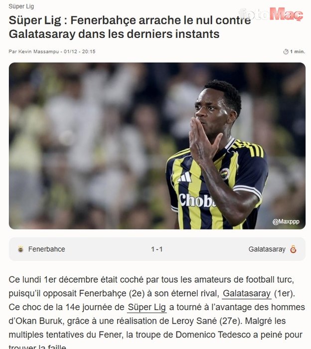 SOFOOT: Fenerbahçe, yenilmezlik serisini son dakikada kurtardı