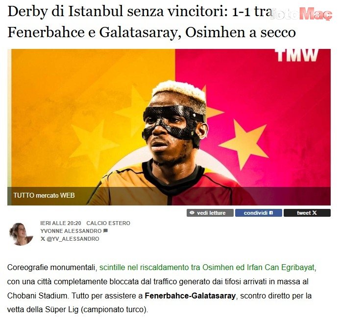 TUTTOMERCATO: Galibiyeti olmayan İstanbul derbisi: Fenerbahçe ile Galatasaray 1-1 berabere kaldı, Osimhen gol atamadı