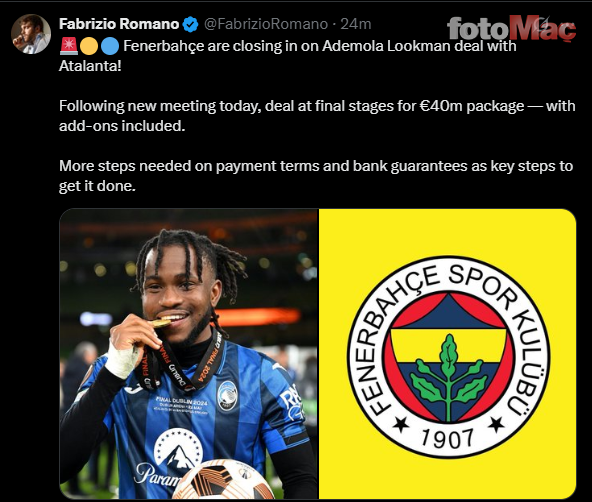 Transferle ilgili son gelişmeyi duyuran isimlerden biri olan Fabrizio Romano, Fenerbahçe’nin Lookman transferini bitirmek üzere olduğunu aktardı.