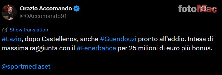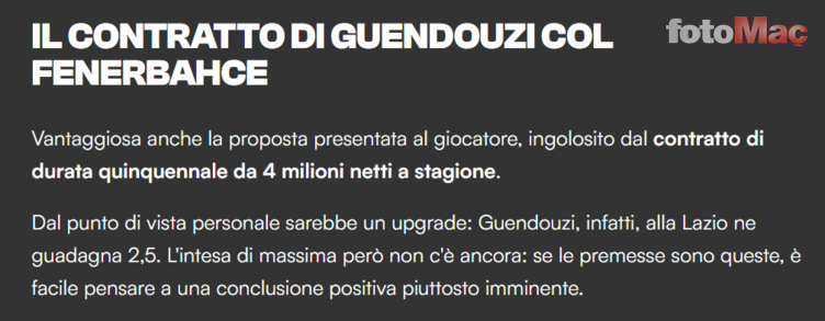 İtalyan basınından Sportmediaset muhabiri Orazio Accomando’nun aktardığı habere göre Fenerbahçe, Guendouzi’nin transferi için Lazio ile 25 milyon euro + bonuslar karşılığında ön anlaşma sağladı.