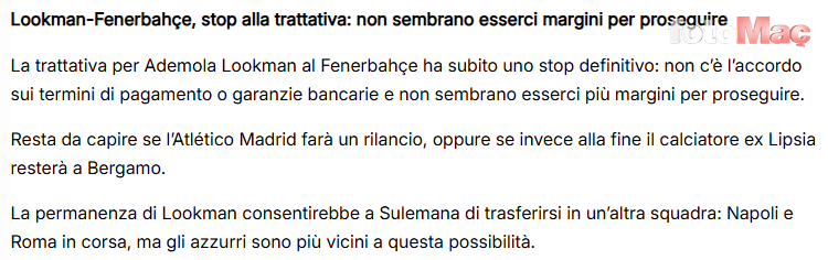 İtalyan gazeteci Gianluca Di Marzio’nun haberine göre Lookman’ın Fenerbahçe’ye transferi için yürütülen görüşmeler kesin olarak durduruldu.