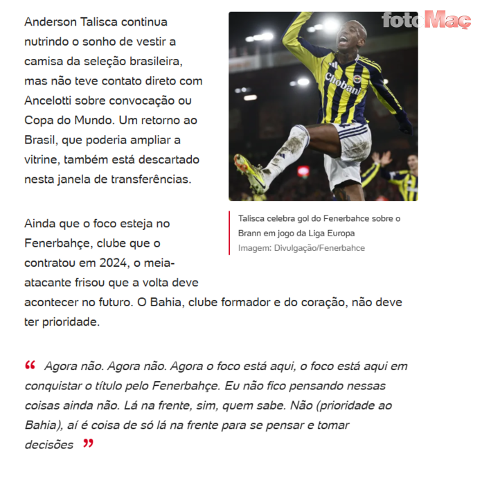Anderson Talisca, Brezilya basınından UOL’ye geleceğine dair yaptığı açıklamalarda önceliğinin net olduğunu vurguladı. Sözleşmesi sezon sonunda bitecek olan 31 yaşındaki yıldız, şu an için Brezilya’ya dönüş planı olmadığını belirterek, odağının tamamen Fenerbahçe ile şampiyonluk hedefi olduğunu söyledi.