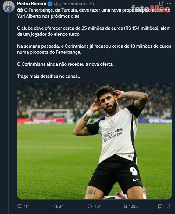 ESPN muhabiri Pedro Ramiro sosyal medya hesabından yaptığı paylaşımda Fenerbahçe’nin, Brezilya ekibi Corinthians’ın 24 yaşındaki Brezilyalı milli forveti Yuri Alberto için harekete geçtiğini yazdı.