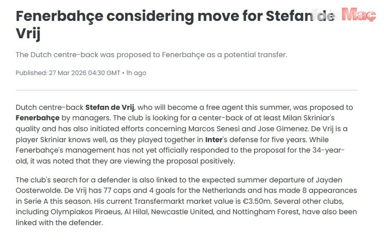 Fenerbahçe’nin ayrıca Marcos Senesi ve Jose Gimenez ile de ilgilendiği öne sürülürken, yönetimin De Vrij önerisine olumlu baktığı belirtildi.