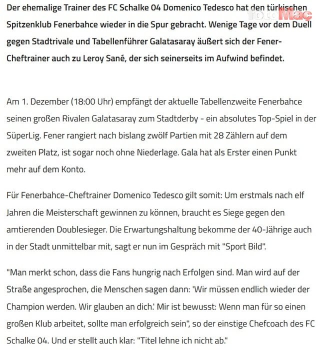 Fenerbahçe Teknik Direktörü Domenico Tedesco, Sport.de’de yer alan habere göre, Alman basınına konuştu. Sarı-lacivertliler ile hedeflerinden bahseden Tedesco, Galatasaray’da top koşturan Leroy Sane hakkında da açıklamalarda bulundu. İşte Tedesco’nun sözleri…