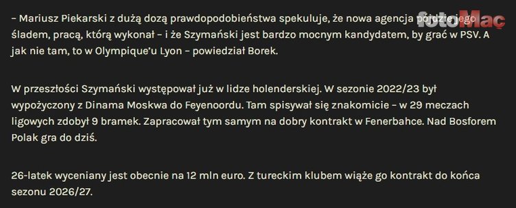 Polonya’nın ünlü gazetecilerinden Mateusz Borek, Fenerbahçe’de forma giyen Polonyalı oyuncu hakkında çarpıcı ifadeler kullandı. Szymanski’nin yakında kulüp değiştireceğini söyleyen Borek, “Szymanski PSV’de forma giymek için çok güçlü bir aday. Eğer orası olmazsa Olympique Lyon’a transfer olacak.” dedi.