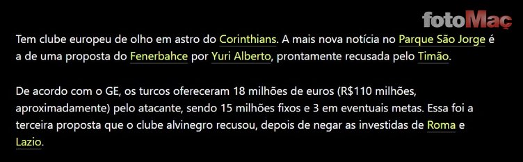 Brezilya basınından Globo’nun haberine göre, Fenerbahçe’nin Yuri Alberto için yaptığı teklif belli oldu.