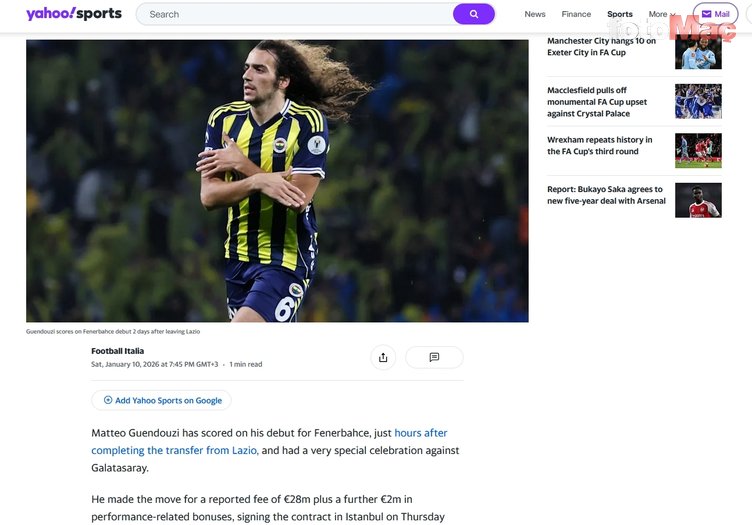 Matteo Guendouzi, Lazio’dan Fenerbahçe’ye transferinden saatler sonra Galatasaray karşısında gol sevinci yaşadı. (Yahoo Sports)