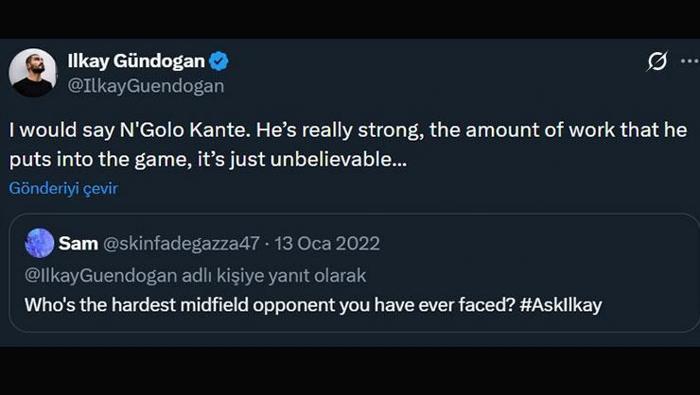 İlkay Gündoğan’ın 2022’de attığı tweet: ‘Karşılıklı oynarken en zorlandığım isim N’Golo Kante. Gerçekten çok güçlü ve oyuna koyduğu enerji miktarı inanılacak gibi değil…’
