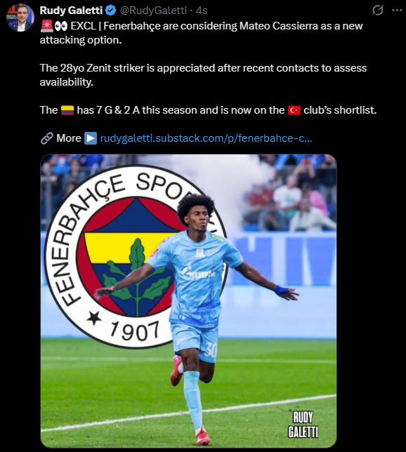 Ara transfer döneminde hücum hattını güçlendirmek isteyen Fenerbahçe’de gözler Alexander Sörtloth transferinde. Sarı-lacivertliler, Norveçli golcünün transferinde mutlu sona ulaşamamaları durumunda yönünü Rusya’ya dönecek. İtalyan gazeteci Rudy Galetti’nin haberine göre Kadıköy ekibi, Zenit forması giyen Mateo Cassierra’yı listesinin üst sıralarına ekledi. Bu sezon 16 maçta 7 gol, 2 asistlik katkı yapan 28 yaşındaki Kolombiyalı futbolcunun da ayrılığa sıcak baktığı aktarıldı. Haberde sarı-lacivertlilerin oyuncu ile temasta olduğu iddia edildi.