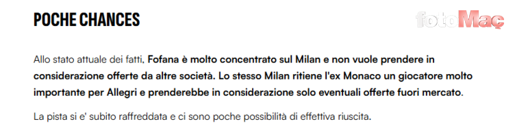 Haberin detayında ise Fofana’nın tamamen AC Milan’a odaklanmak istediği ve herhangi bir transfer ihtimalini hem oyuncunun hem de kulübün açıkça reddettiği aktarıldı.