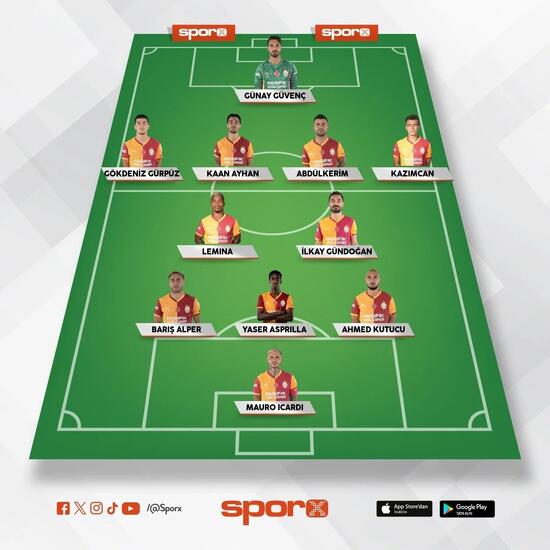 Galatasaray: Günay, Gökdeniz, Kaan, Abdülkerim, Kazımcan, Lemina, İlkay, Barış Alper, Asprilla, Ahmed, Icardi