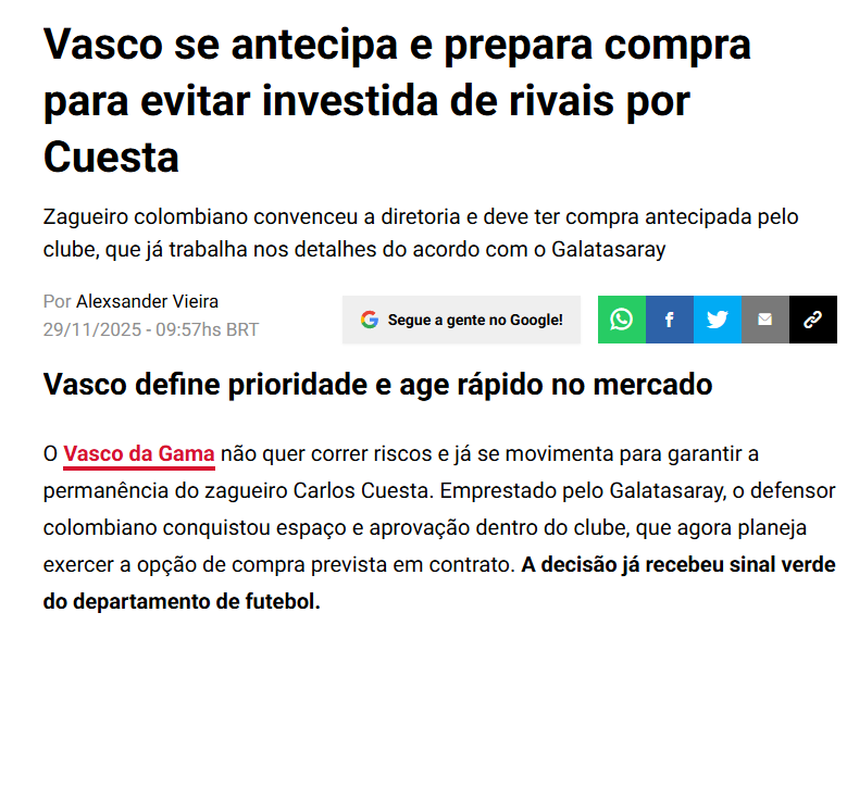 Brezilya basınından Bola Vip’in haberine göre Vasco da Gama, sezon başında Galatasaray’dan satın alma opsiyonuyla kadrosuna kattığı Carlos Cuesta için resmi adımları atmaya hazırlanıyor.