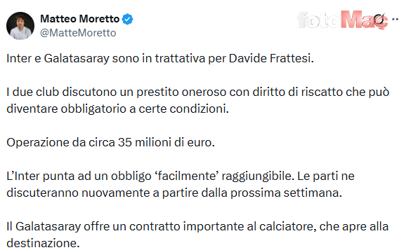 Moretto haberinde son olarak Galatasaray’ın Frattesi’ye önemli bir sözleşme teklif ettiğini ve Frattesi’nin de bu transfere olumlu yaklaştığını belirtti.
