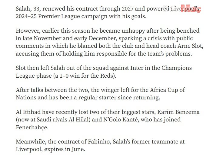 33 yaşındaki Salah, Liverpool ile sözleşmesini 2027 yılına kadar uzatmış ve 2024–25 sezonunda attığı gollerle takımının Premier League performansında önemli rol oynamıştı. Buna rağmen sezon içinde teknik direktör Arne Slot ile yaşadığı gerilim dikkat çekmişti.