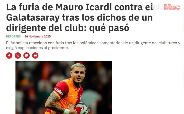 Arjantinli gazeteci, “Mauro Icardi ile Galatasaray arasındaki ilişkiler iyi değil. Hatta bir Türk yetkili, yönetim kurulu toplantısında onu eleştirdi ve konuyla ilgili yeni gelişmeler yaşanıyor. Bana söylenen, Icardi’nin birkaç gün önce Arjantin seyahatinden sonra antrenmana döndüğünde öfkeli olduğu ve kendisine yönelik yapılan yorumlar için açıklama talep ettiği.” ifadelerini kullandı.