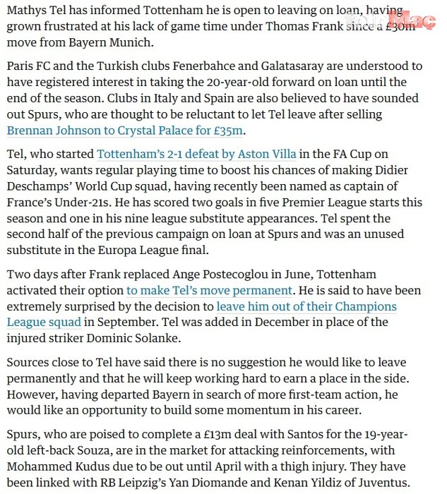 Ancak Tottenham yönetiminin, Brennan Johnson’ı 35 milyon sterline Crystal Palace’a sattıktan sonra Tel’in ayrılmasına izin verme konusunda isteksiz olduğu da haberde yer alan bilgiler arasında.