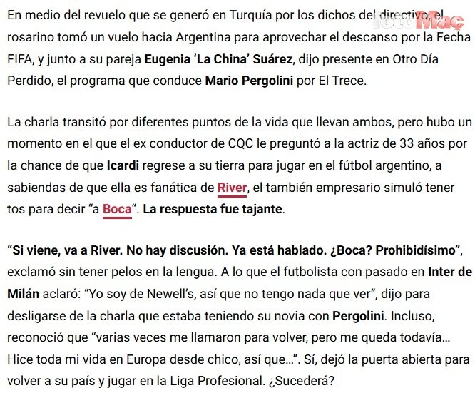 aspor.com.tr editörü Kağan Soytorun’un derlediği habere göre, sunucu Pergolini, Icardi’nin partneri Suarez’e, Icardi’nin Arjantin’e dönüp futbol oynama ihtimalini sordu. Suarez ise bu ihtimale cevap verdi: