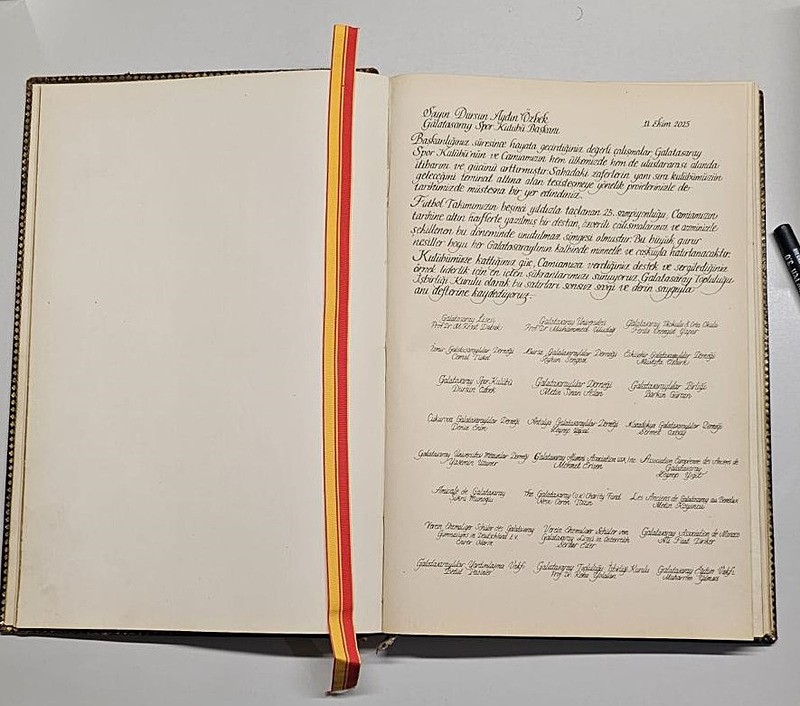 Atatürk’ün yanı sıra bazı devlet büyüklerinin de imzasının yer aldığı Galatasaray Lisesi anı defterine Galatasaray Topluluğu İşbirliği Kurulu’nun kararı ve ortak önerisiyle Galatasaray Kulübü Başkanı Dursun Aydın Özbek’e hitaben yazılan bir teşekkür yazısı hazırlandı.
