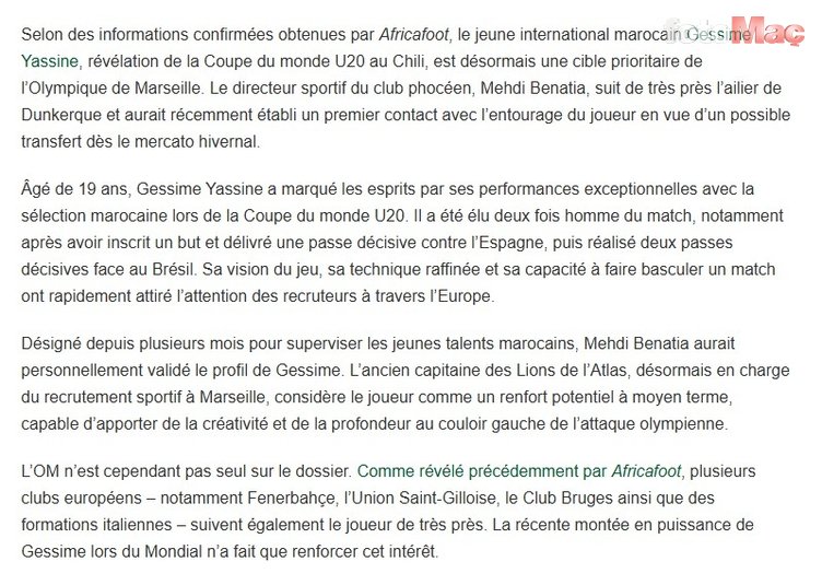 Africa Foot kaynaklı haberde, Faslı futbolcuya sarı-lacivertlilerin yanı sıra Marsilya, Union Saint-Gilloise, Club Brugge ve bazı İtalyan takımlarının da talip olduğu belirtildi.