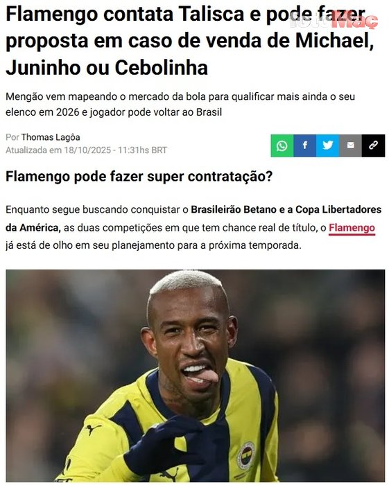 Flamengo, Anderson Talisca için oyuncuyla resmi bir temas kurdu ancak henüz teklif aşamasına geçmedi. Kulüp yönetimi, transferin sadece uygun şartlar oluştuğunda ve oyuncunun maliyeti bütçeye uyduğunda gerçekleşebileceğini değerlendiriyor.