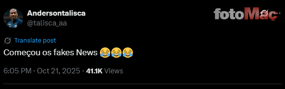 Öte yandan Fenerbahçe’nin Brezilyalı yıldızı Anderson Talisca, hakkındaki iddialara kişisel sosyal medya hesabından cevap verdi. Yıldız oyuncu yaptığı paylaşımda “Yalan haberler başladı” ifadesini kullandı.