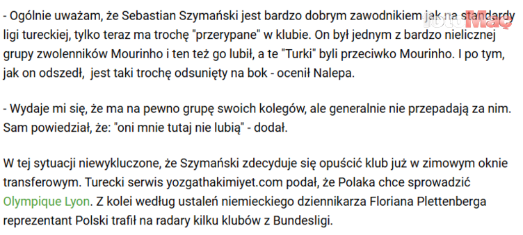 Nalepa, Jose Mourinho’nun ayrılığının ardından Szymanski’nin gözden düştüğünü belirterek şu ifadeleri kullandı: “Szymanski, Türkiye ligi standartlarına göre çok iyi bir futbolcu. Ancak şu anda kulüpte biraz sıkıntılı bir dönemde. Mourinho onu seviyor ve destekliyordu fakat Türkler Mourinho gibi düşünmüyor. O ayrıldığından beri Sebastian biraz kenarda kaldı.”