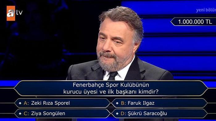 1 milyon TL değerindeki soru “Fenerbahçe Spor Kulübü’nün kurucu üyesi ve ilk başkanı kimdir?” şeklinde geldi. Şıklarda Zeki Rıza Sporel, Faruk Ilgaz, Ziya Songülen ve Şükrü Saracoğlu yer aldı.