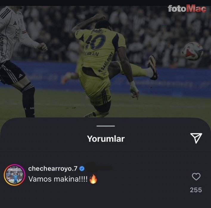 Arroyo, Fenerbahçe’nin Beşiktaş’a karşı galip gelmesini sağlayan golü kaydeden Jhon Duran’ın sosyal medya hesabından yaptığı paylaşıma ‘Vamos makina!!!’ (Haydi makina!!!) yorumunu yaptı.