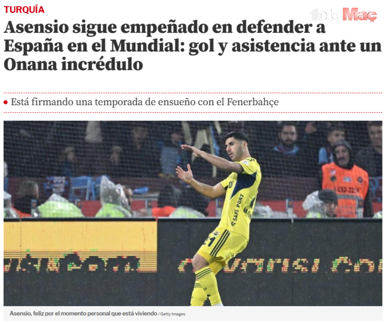 “Asensio, Dünya Kupası’nda İspanya’yı savunmaya kararlı: Onana’nın şaşkın bakışları altında gol ve asist yaptı. Asensio, Fenerbahçe ile rüya gibi bir sezon geçiriyor. Bu sezon Fenerbahçe maçlarını izlemek, Marco Asensio’nun zirve performansını izlemekle eş anlamlı. 30 yaşında, Real Madrid’den ayrıldıktan sonra inişli çıkışlı bir performans sergilediği birkaç sezonun ardından, Türk futbolunun tutkusu Balear Adaları’ndan gelen bu oyuncunun en iyi performansını ortaya çıkardı. Dünya Kupası yılı ve herkes kadroya girme şansını en üst düzeye çıkarmaya çalışıyor. Uzun süredir kadroya çağrılmasa da, sol ayağındaki yeteneği herkes biliyor. Ve eğer şu anda bu kadar iyi formdaysa… neden olmasın?”