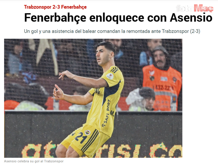 “Fenerbahçe, Asensio ile çılgına döndü: Attığı gol ve yaptığı asist, Trabzonspor karşısında geri dönüşün anahtarı oldu. İspanyol oyuncunun form durumu inanılmaz. Trabzonspor’a karşı attığı gol ve yaptığı asistle birlikte bu sezon toplamda 18 gole katkıda bulundu. Fenerbahçe on yıldan fazla bir süredir ilk kez şampiyonluğu kazanırsa, Asensio tarihe adını yazdıracak.”
