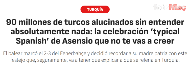 “90 milyon Türk şaşkına döndü: Asensio’nun ‘tipik İspanyol’ kutlaması inanılmazdı. Marco Asensio Fenerbahçe’ye 3-2’lik galibiyeti getiren golü attı ve bu gol sevincini, Türkiye’de açıklamak zorunda kalacağı kesin olan bir hareketle anmaya karar verdi.”