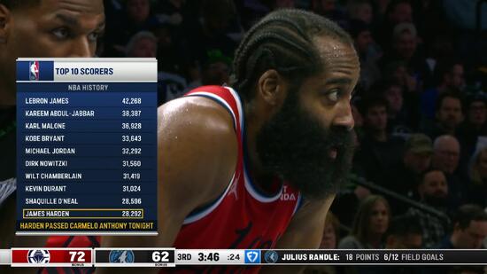 Kariyerinde 28 bin 303 sayıya ulaşan Harden, Carmelo Anthony’yi (28 bin 289) geride bırakarak NBA normal sezonlarında tarihin en skorer 10. oyuncusu oldu.