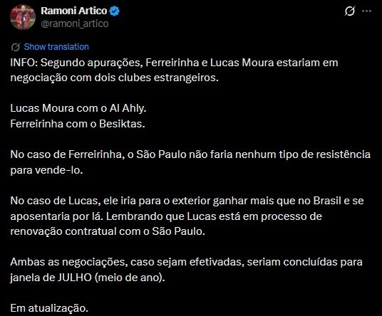 Brezilya basınından Ramoni Artico’nun haberine göre siyah-beyazlılar, Sao Paulo forması giyen Ferreirinha ile transfer görüşmeleri yürütüyor.