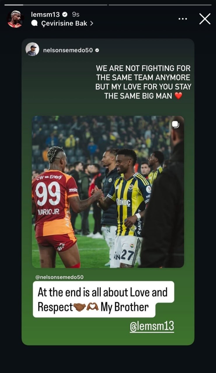 Mücadele sonrası Fenerbahçeli futbolcu Nelson Semedo ve Galatasaraylı futbolcu Mario Lemina’nın paylaşımları dikkat çekti. Semedo sosyal medya hesabından Lemina ile olan fotoğrafını paylaşarak, “Günün sonunda her şey sevgi ve saygıdan ibaret kardeşim.” notunu düştü. Lemina ise Semedo’nun bu paylaşımına, “Artık aynı takım için mücadele etmiyoruz ama sana olan sevgim aynı koca adam.” şeklinde yanıt verdi.