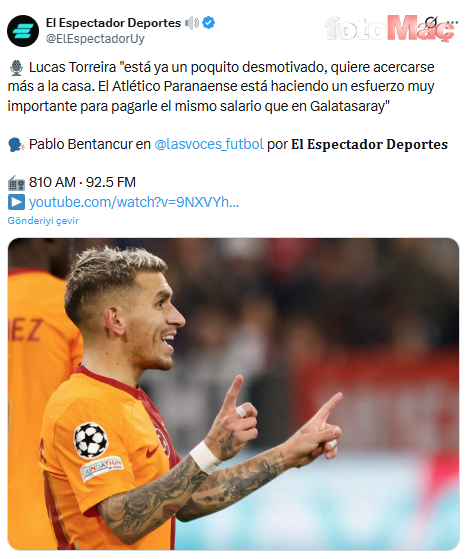 Uruguay’daki “El Espectador Deportes” kanalının “Las Voces del Futbol” programına konuşan Bentancur, Torreira için “Artık birazcık motivasyonunu kaybetmiş durumda, eve daha yakın olmak istiyor. Atlético Paranaense, Galatasaray’daki aynı maaşı ona ödemek için çok büyük bir çaba sarf ediyor.” ifadelerini kullandı.
