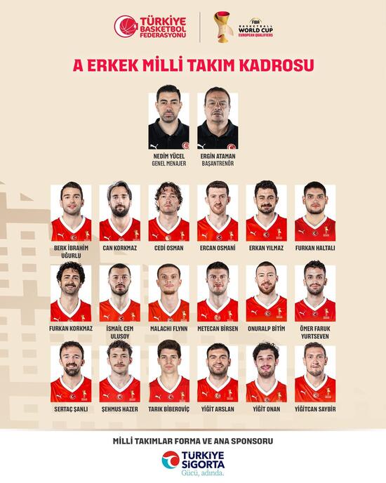 A Milli Takımımız, FIBA 2027 Basketbol Dünya Kupası Elemeleri’nde 27 Şubat Cuma günü TSİ 21.00’de deplasmanda ve 2 Mart Pazartesi günü saat 21.00’de Basketbol Gelişim Merkezi’nde Sırbistan ile karşı karşıya geleceği maçlar için aday kadro belirlendi.